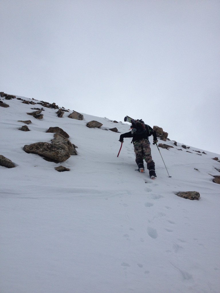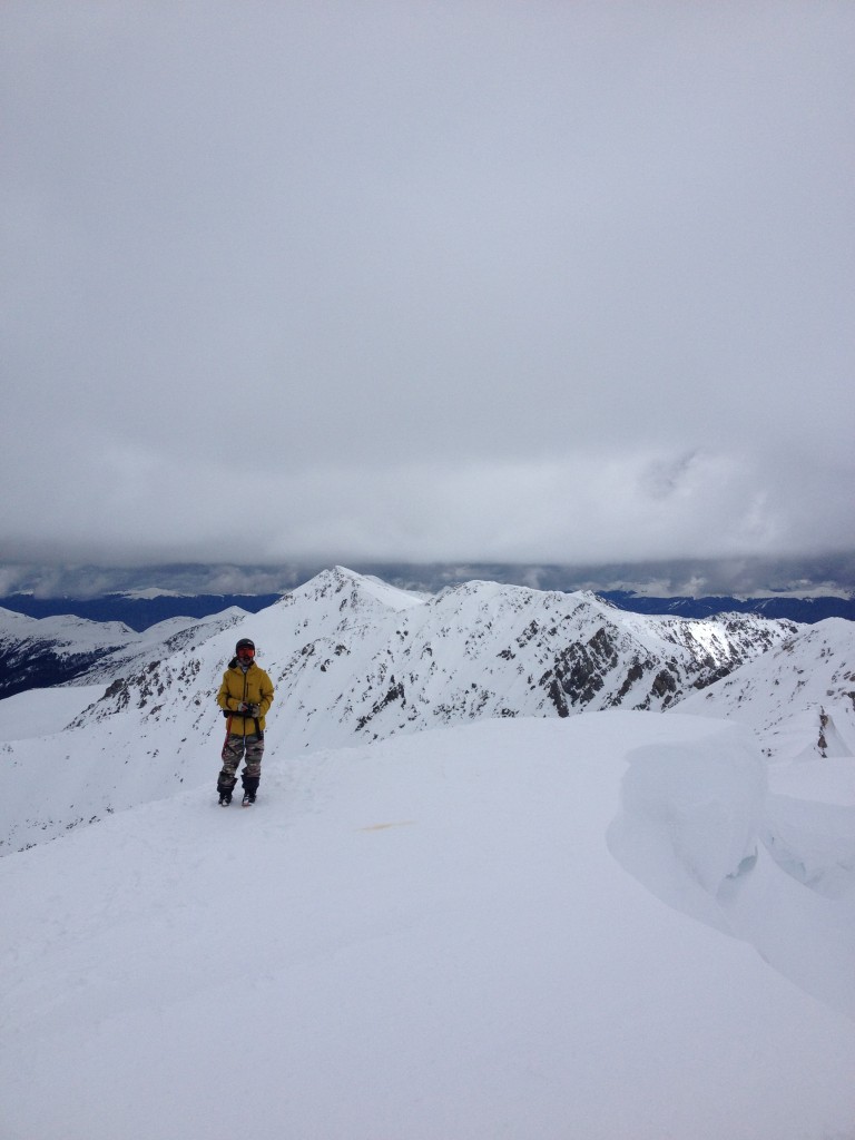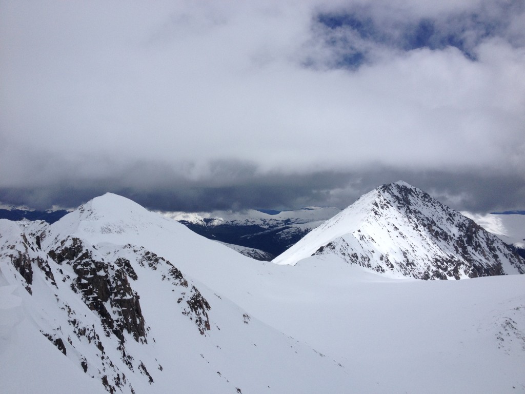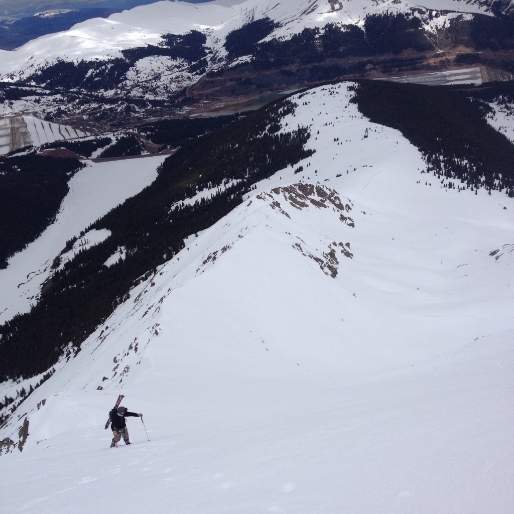 After having to abandon a few options in the Mosquito range earlier in the morning, Jeff Kepler and I stumbled upon the approach to this peak while exploring Mayflower Gulch. With solid stability, a moderate skin quickly turned into a crampon approach along a narrow ridge with some fun maneuvers. Transitioning below the top, we quickly captured the summit before choosing our descent. After some thoughtful dialog to confirm the route, we began leap frogging our way down through two couloirs and eventually made it back to the skin track and trailhead.