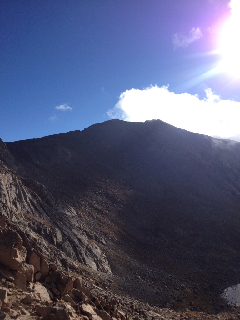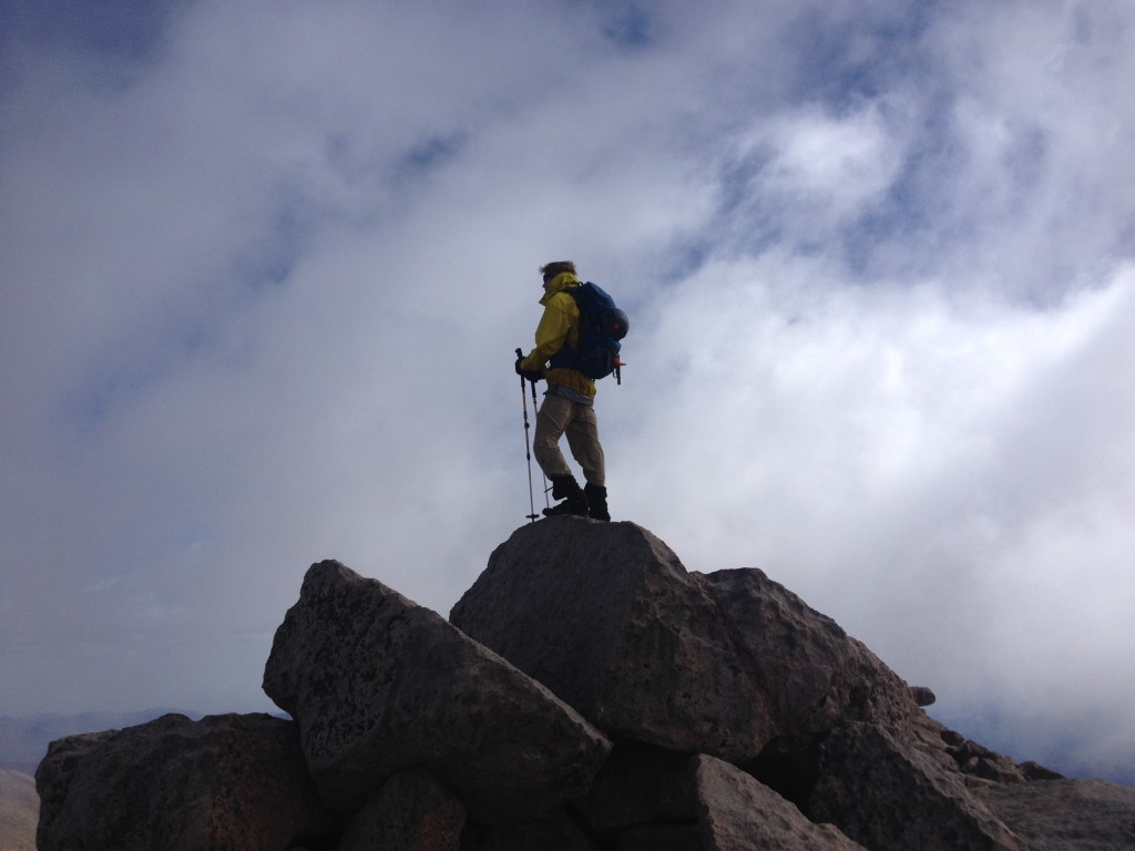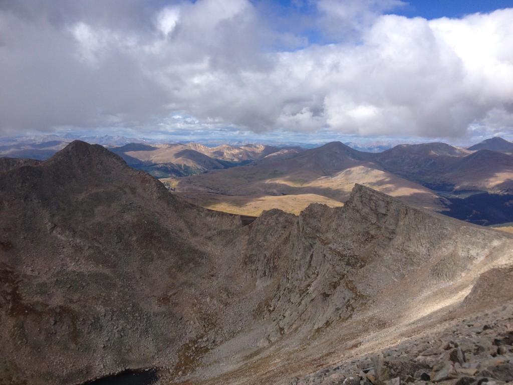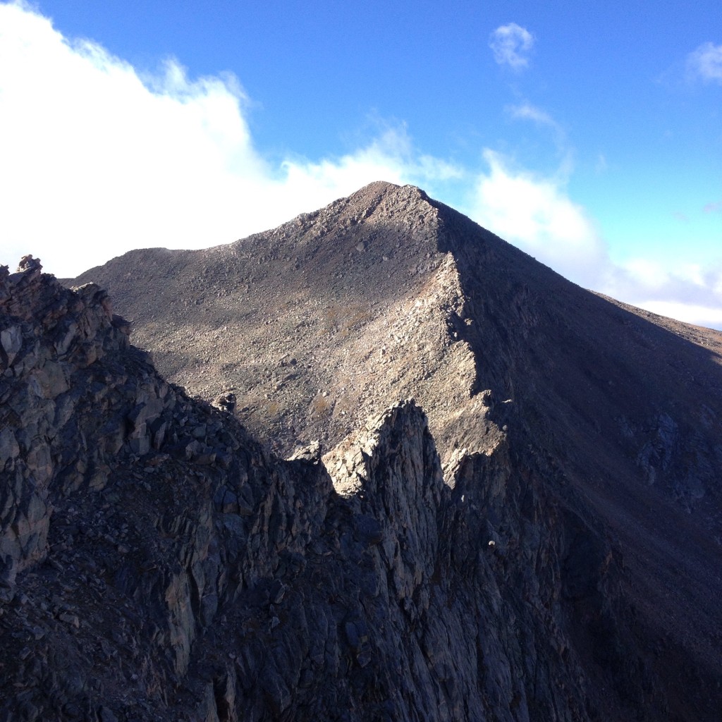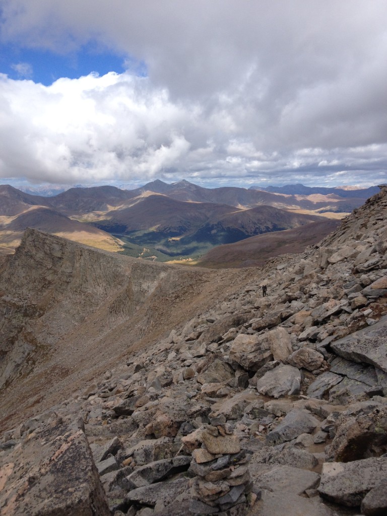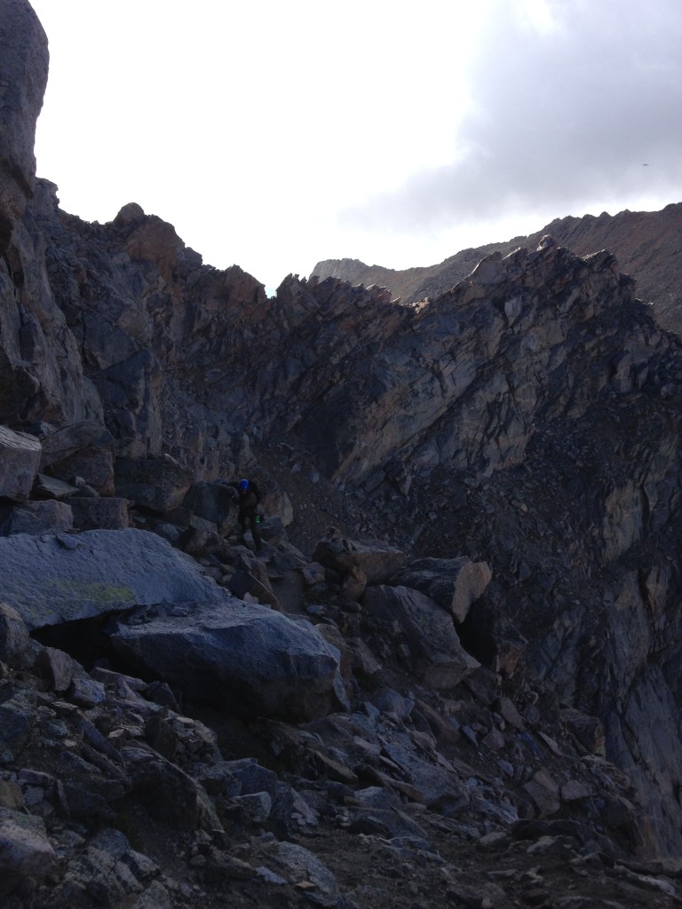 Looking to get our class 3 fix, Pat Johnson and I decided that the Sawtooth traverse between Mt. Bierstadt and Mt. Evans was good to go. We made our way from the trailhead around 5:45 AM and worked our way to the summit of Bierstadt. We did not waste much time on the summit with the mountains engulfed in clouds and a chilling temperature in the air.