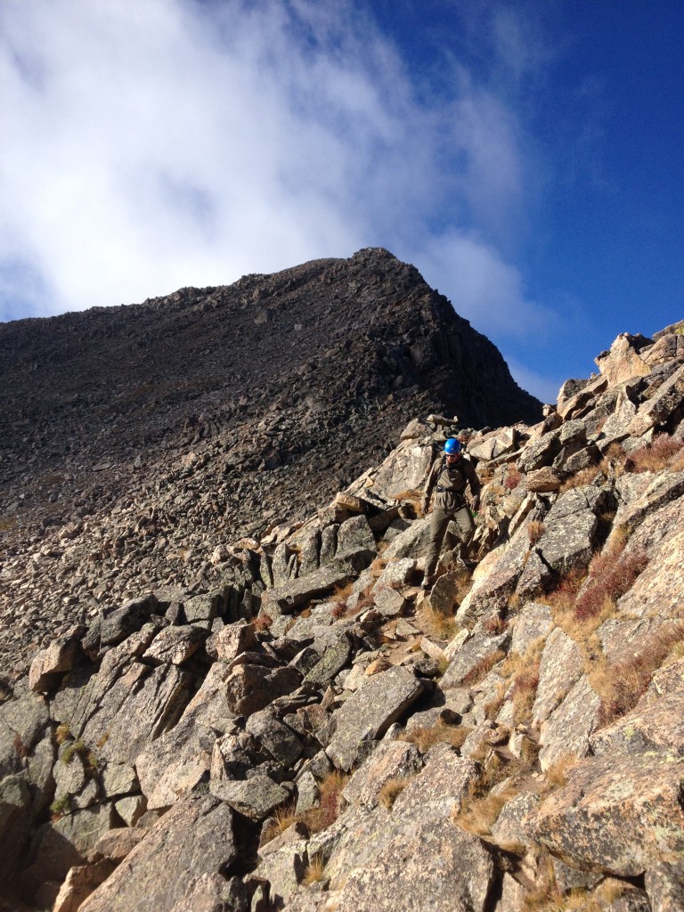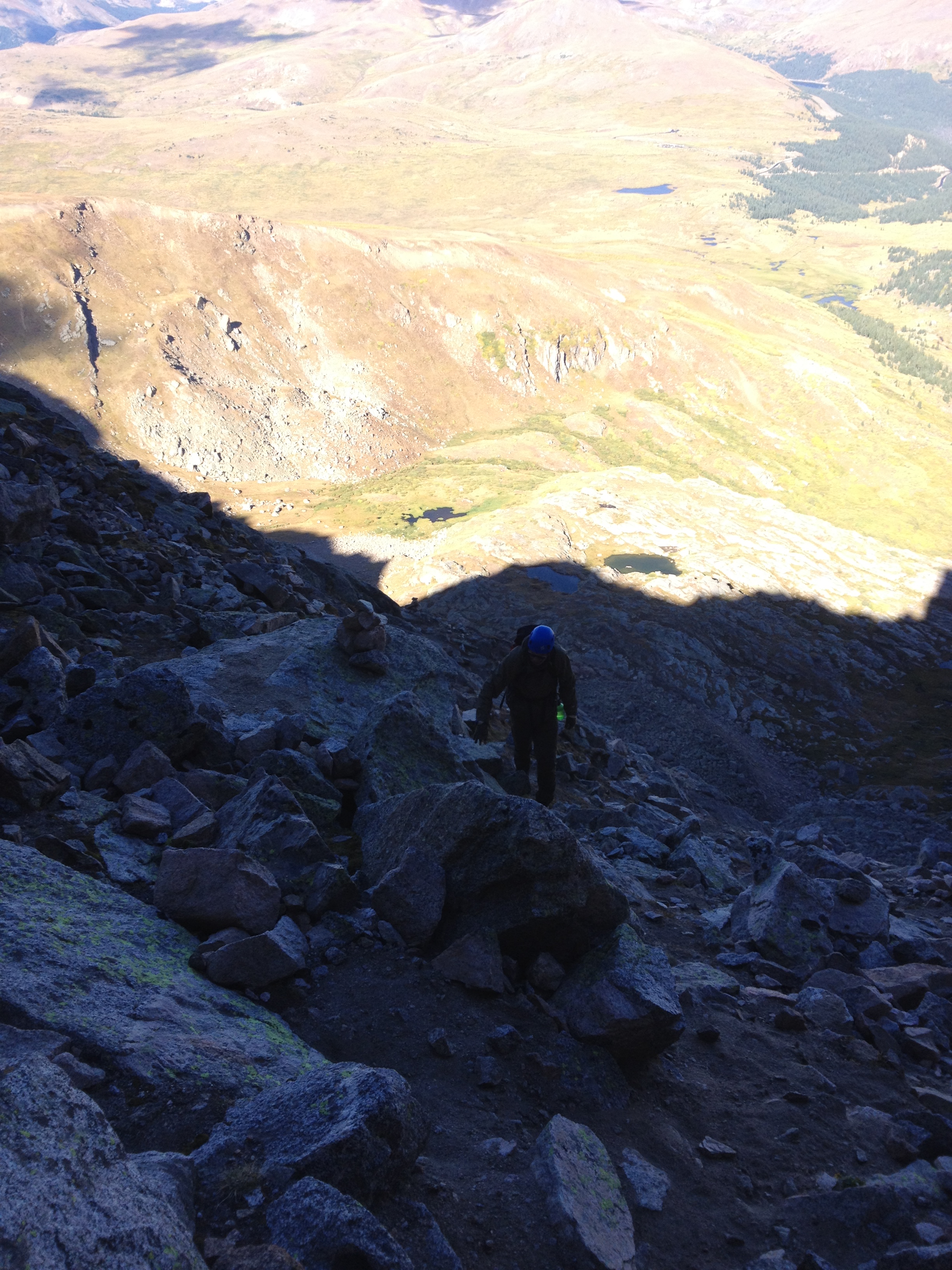 We then hiked the rest of the way to the summit of Mt. Evans. After a quick break with the tourists we started our return descent to the top of Guanella Pass where we had started. The descent involved a lengthy and steep gully that had us carefully billy goating our way down until we were met with an easy stroll back to the trailhead. The stoke was definitely high as this traverse brought some fun climbing and exposure.