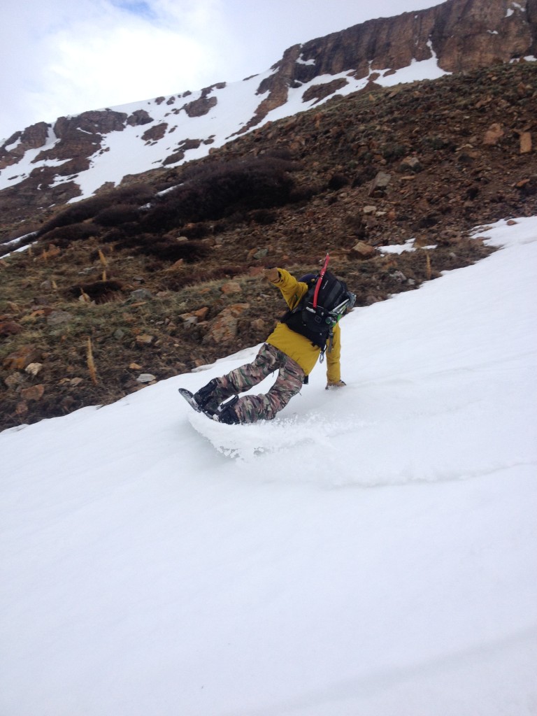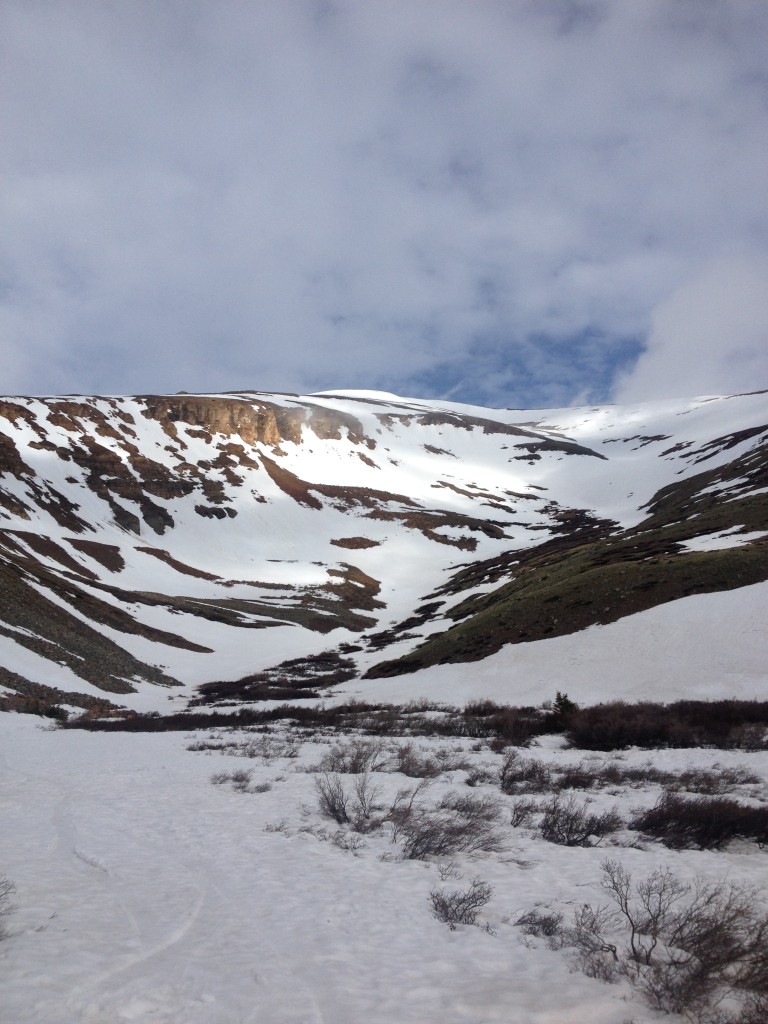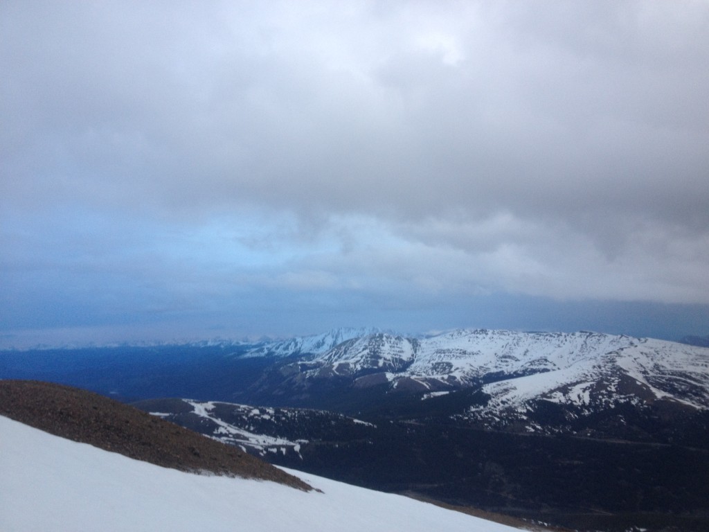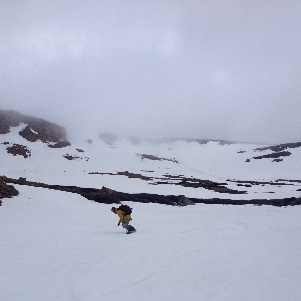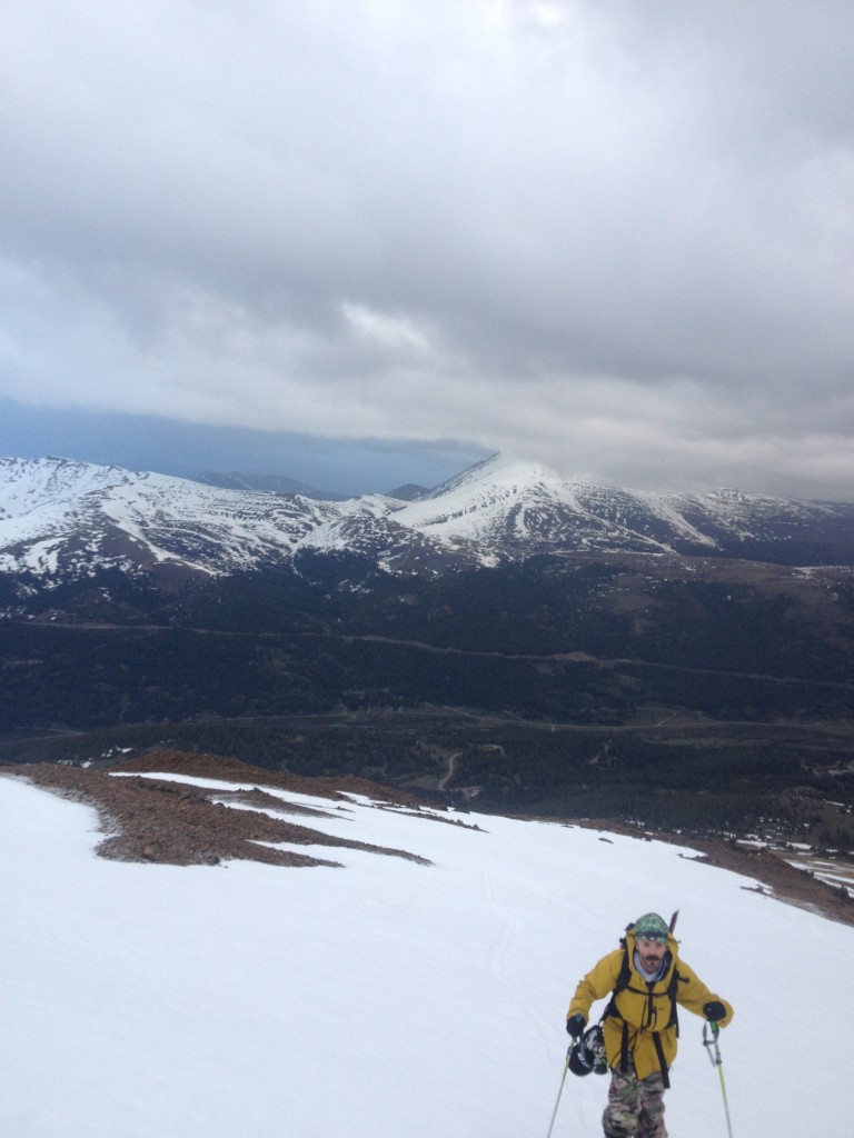 The east slopes route to Bross’ summit is straightforward but very steep in areas. Although we did skin for a short time, hiking on the barren ground provided us with a much more efficient ascent. At the top the summit provided us with a cloudy view totally void of visibility. Luckily the snow above treeline was in a stable state as freezing temperatures provided us with the confidence to descend just below it’s summit. As we made our way down in a safe fashion we were rewarded with great turns. With another 14er snowboard descent in the books we were ready for more.