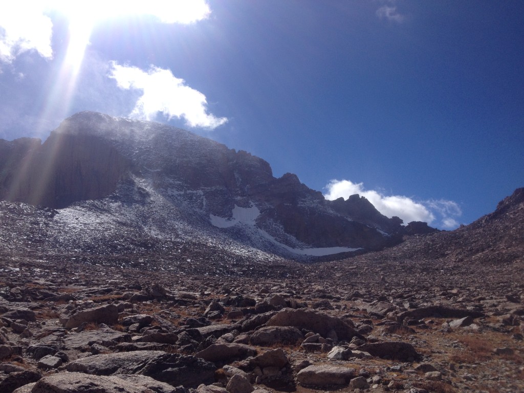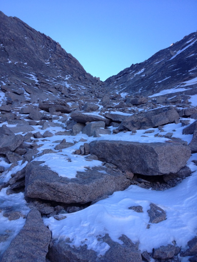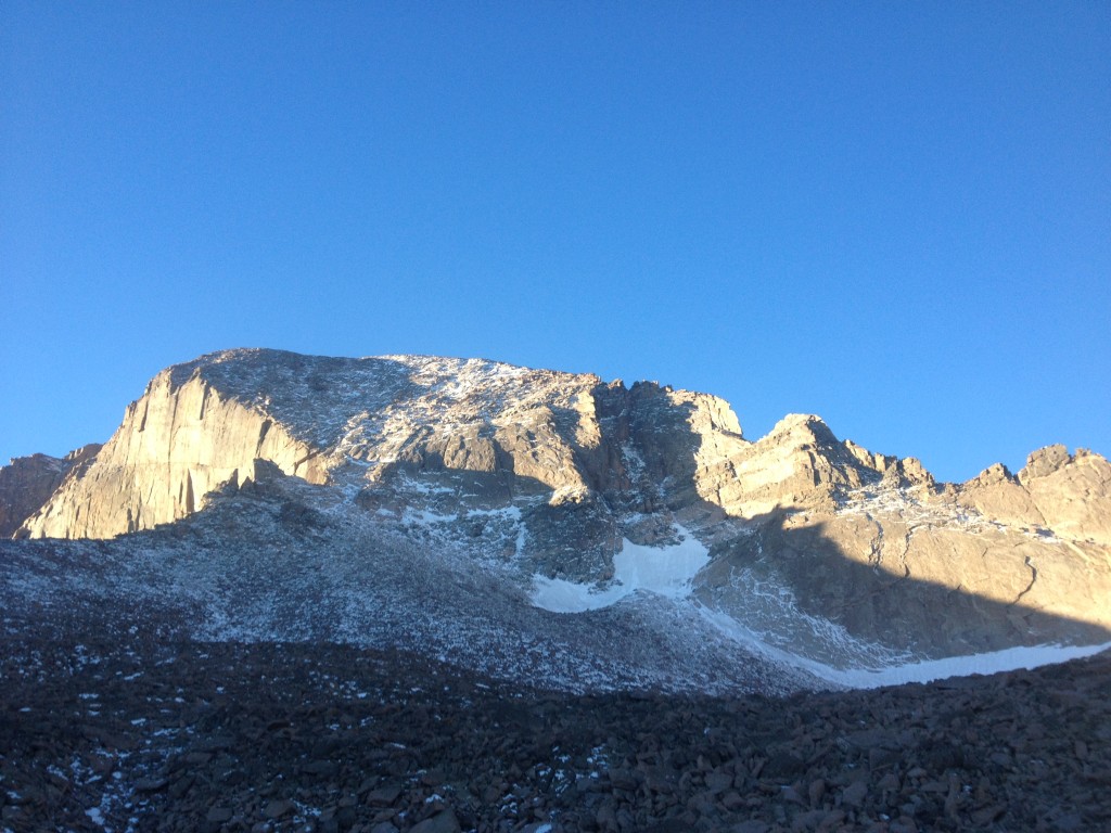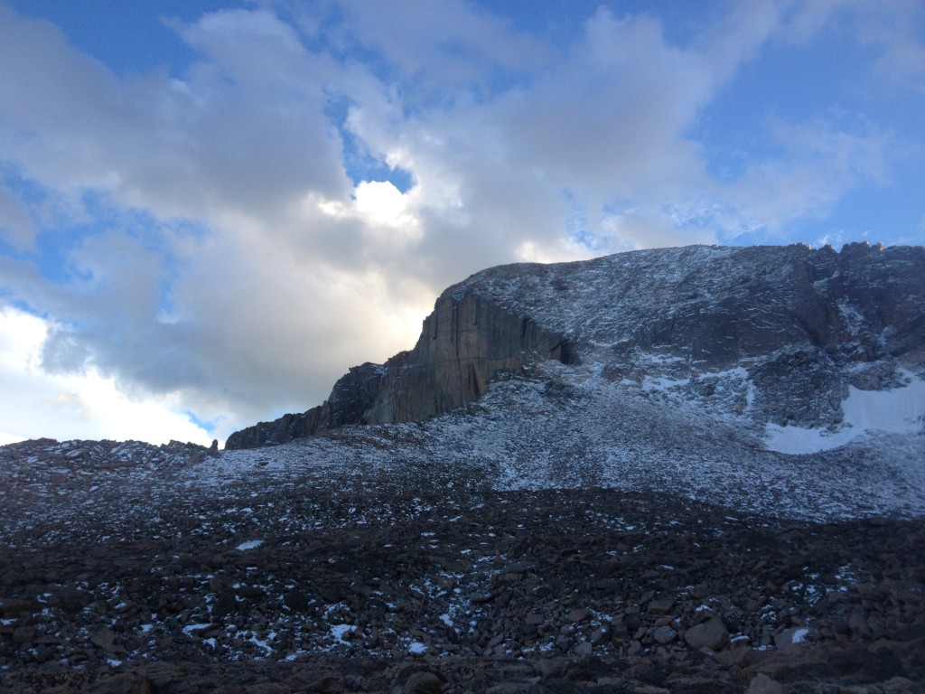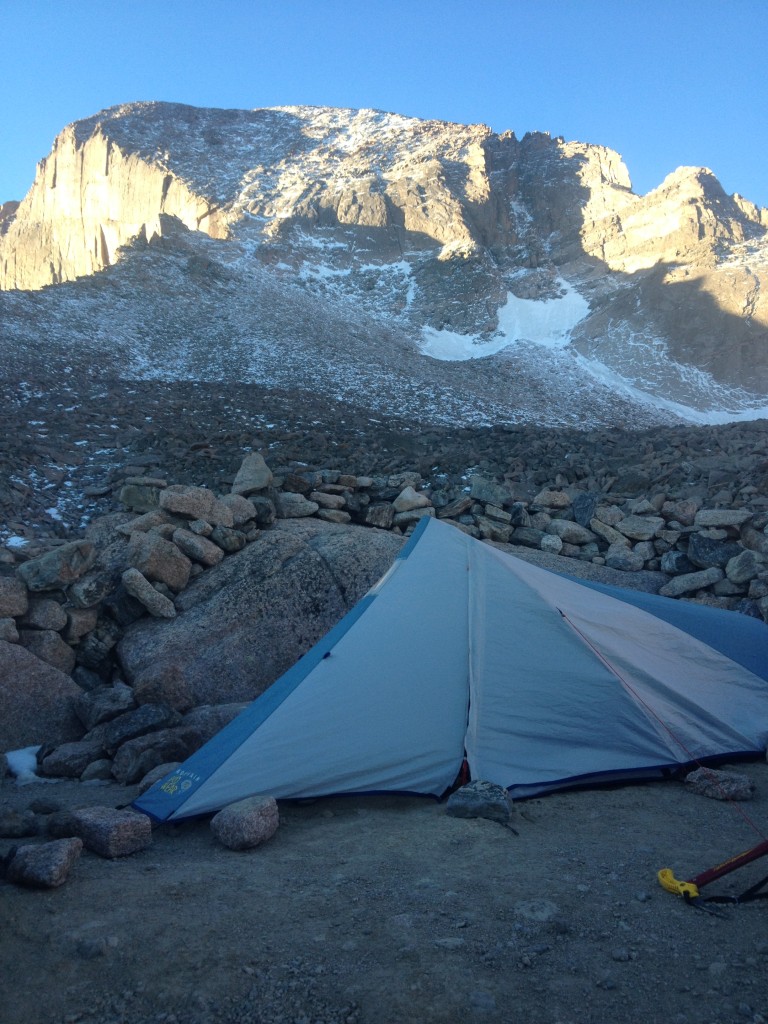 Summer was fading away and fall was already in full force in the high country. Pat “Perry” Johnson and I decided it was time to knock out a Front Range 14er that we had waited to do until tourist season was over, Longs Peak. We planned to depart from the trailhead in Estes Park on a Sunday morning, camp at the Boulder Field right below the Keyhole, and summit Longs Peak the following day. This would hopefully ensure relatively low traffic on the route and allow us to enjoy an unfamiliar area without the congestion it typically attracts in the summer months. I talked to a ranger a few days before to make sure a campsite was available and work out any fees we would need to pay before heading up on the mountain. He informed me that the Trough section of the route contained both ice and snow so I decided it was a good idea for Perry and I to bring an ice axe and crampons to be on the safe side. We made our way to the trailhead early Sunday from Breckenridge and started our approach to basecamp later that morning. After one of the windiest approaches either one of us had ever experienced we arrived at the Boulder Field, setup camp, and relaxed, mostly in our tents to escape the incessant wind that persisted throughout the night.
