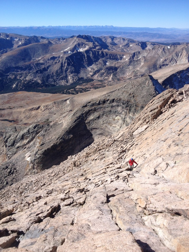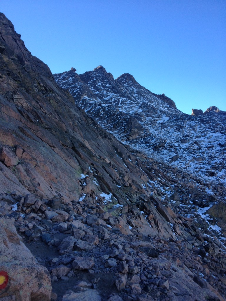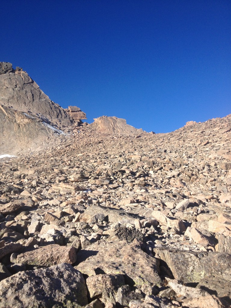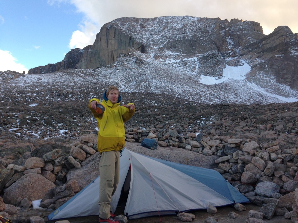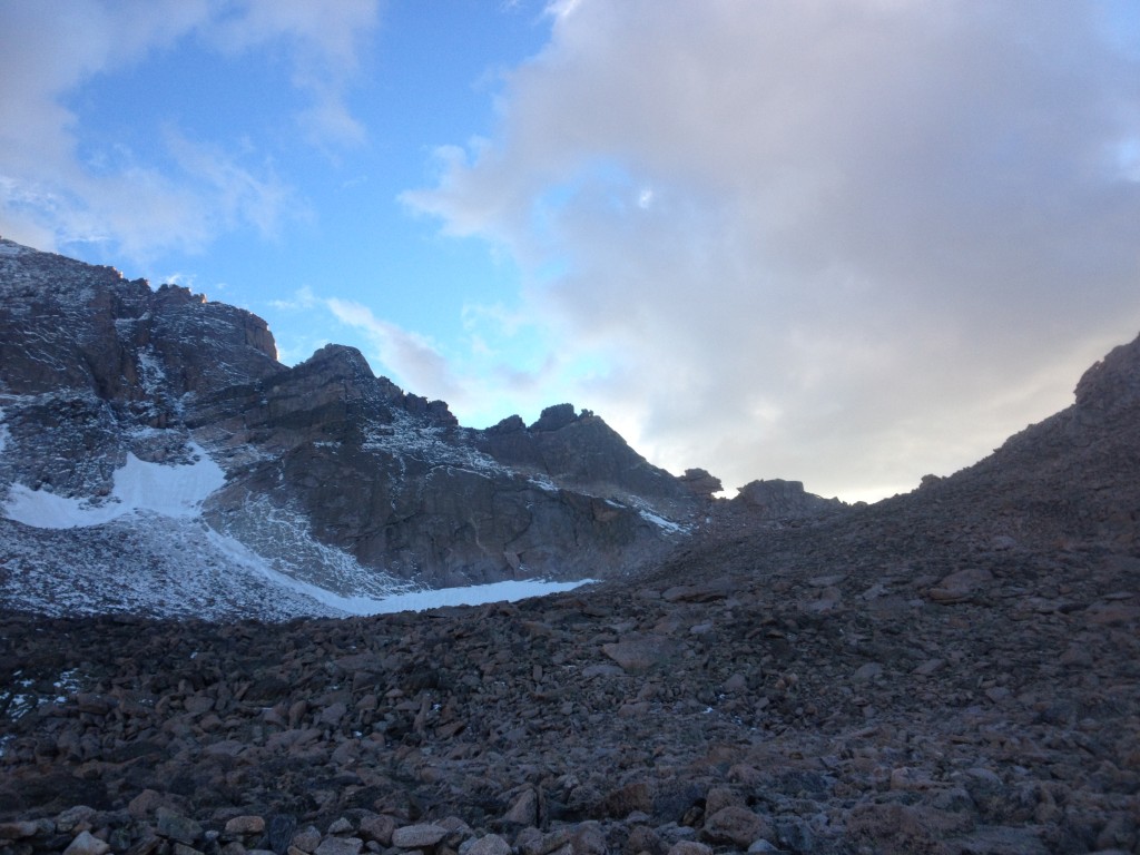 Summer was fading away and fall was already in full force in the high country. Pat “Perry” Johnson and I decided it was time to knock out a Front Range 14er that we had waited to do until tourist season was over, Longs Peak. We planned to depart from the trailhead in Estes Park on a Sunday morning, camp at the Boulder Field right below the Keyhole, and summit Longs Peak the following day. This would hopefully ensure relatively low traffic on the route and allow us to enjoy an unfamiliar area without the congestion it typically attracts in the summer months. I talked to a ranger a few days before to make sure a campsite was available and work out any fees we would need to pay before heading up on the mountain. He informed me that the Trough section of the route contained both ice and snow so I decided it was a good idea for Perry and I to bring an ice axe and crampons to be on the safe side. We made our way to the trailhead early Sunday from Breckenridge and started our approach to basecamp later that morning. After one of the windiest approaches either one of us had ever experienced we arrived at the Boulder Field, setup camp, and relaxed, mostly in our tents to escape the incessant wind that persisted throughout the night.