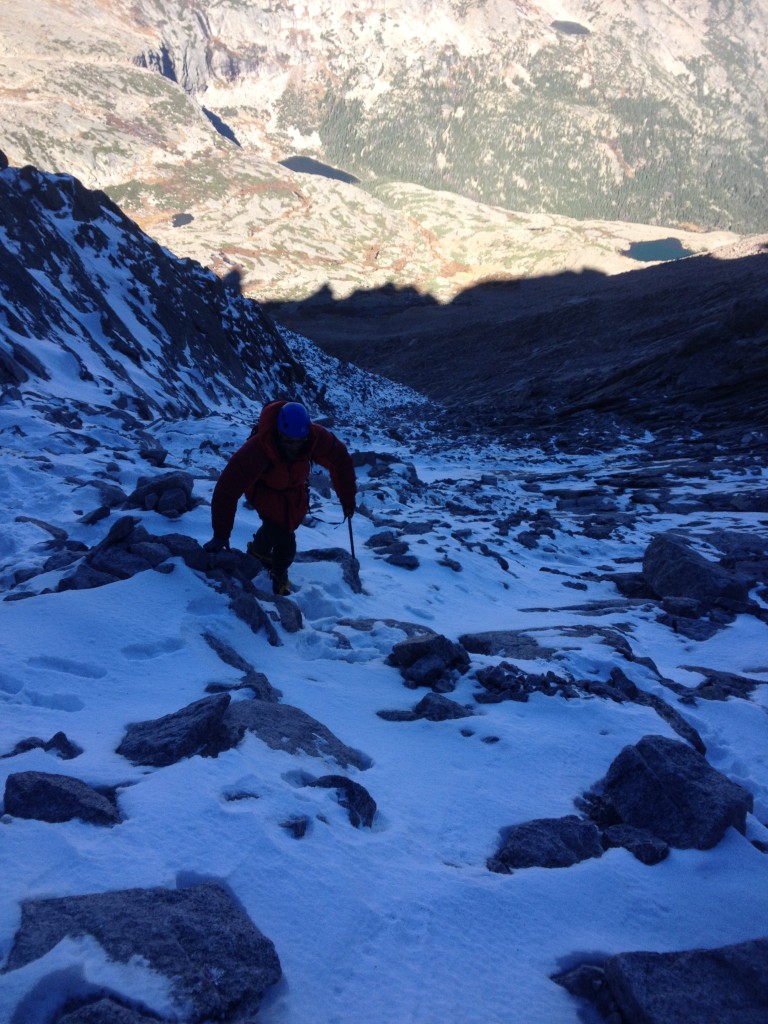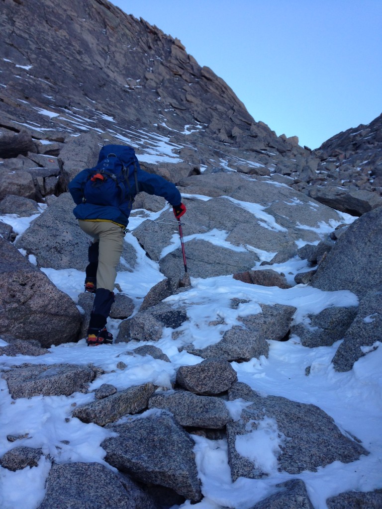 After an extremely windy night we were greeted with a beautiful day to attempt the summit. With some reluctance we finally made it out of our sleeping bags, ate breakfast, and began our ascent toward the Keyhole. After a relatively easy scramble we found ourselves entering the Trough section. As promised, we were greeted with snow and ice but were well prepared. After navigating the easier sections we donned crampons and ice axes and completed the crux section to the start of the Narrows. Here we were happy to have dry rock and sun which allowed us to continue towards the Homestretch section quickly.